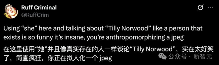 网友Ruff Criminal认为,用「她」来称呼Tilly太好笑了,「你们在给一张 JPEG 拟人化」。