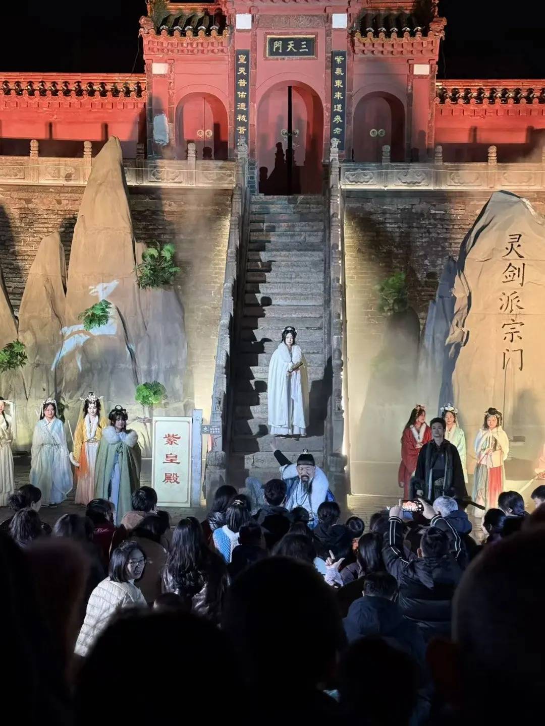 想换个画风?来九老仙都。一进门,就像触发了什么结界。抚琴的道长、舞剑的仙子、藏在角落里的NPC……随时可能跟你搭话,随时可能给你派个任务。晚上还有非遗打铁花和烟火瀑布滚烫的铁花砸向水面,像碎了一河的星星;烟火从高处倾泻,像天幕开了道金口。20:00-21:30|南门歌王挑战赛