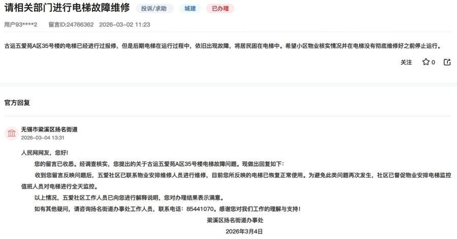 “电梯之前就报修过,可没多久又出故障。”3月2日,无锡市梁溪区居民施女士反映,她住在古运五爱苑小区,所在楼栋多次出现电梯运行故障,存在安全隐患。当地扬名街道回复,接到反映后,社区联系物业安排维修人员进行了维修,并督促物业安排电梯监控值班人员对电梯进行全天监控。