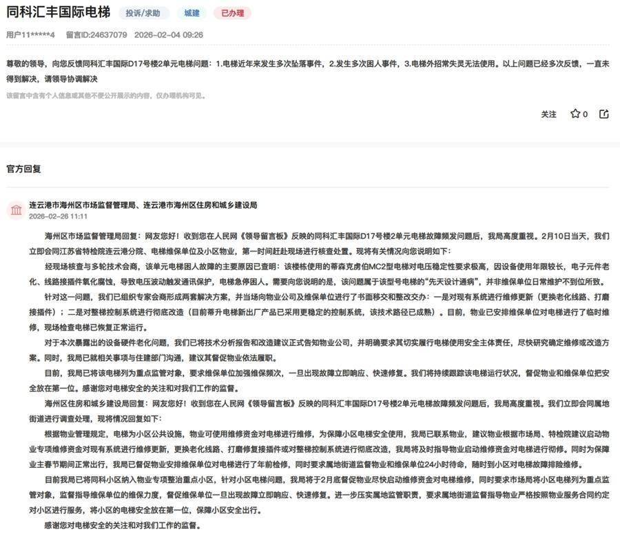 “从去年底到今年2月,这电梯就没让人省心过。”同是2月4日,连云港市海州区同科汇丰国际D17号楼居民刘女士留言,她所住的这幢楼共31层,电梯多次出现坠落、困人、按键失灵等情况,“业主群里时不时就有邻居反映被困,家里老人接孩子放学也被困过。”