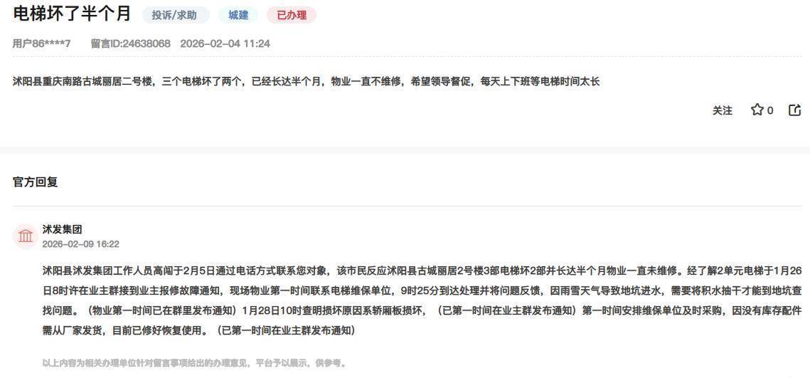 “27层的高楼,三部电梯坏了两部。”2月4日,宿迁市沭阳县古城丽居小区居民李先生留言求助,“电梯已经坏了半个月,每天上下班要等很久”。接到留言后,沭阳县沭发集团对接核实,同步督促物业、电梯维保单位进场排查。据了解,问题出在厢板损坏,工作人员及时采购了配件。2月9日,两部故障电梯均恢复正常使用。